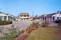 Description:Van Nuys, CA. The Hermitage Motel (8008 Van Nuys Blvd.), exterior of U-shaped white motel with green roof and rose bushes in foreground.