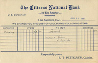 Description:Postcard from The Citizens National Bank of Los Angeles. Dated June 11, 1917. Recipient could document deposits and charges on the postcard.