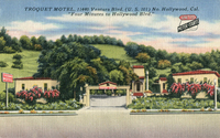 Description:North Hollywood, CA. Troquet Motel (11440 Ventura Blvd (US 101), owner-managers: Mr. and Mrs. Joseph S. Juracka. Street view of the "motor court" with larger trees and different sign. Postmarked July 2, 1952, Los Angeles. The Jurackas may have been Czech immigrants. [show more]