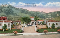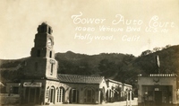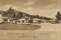 Description:Hollywood (Studio City), CA. Tower Motor Hotel (10980 Ventura Blvd. (US 101), manager: Ed Townsend. Sepia-tone image of street view of motel, with tower, gas pumps, freestanding sign. Inset of cottages with private garages.