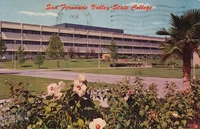 Description:San Fernando Valley State College, Northridge, CA. Unidentified "beautiful new modern building" on SFVSC campus. Hibiscus flowers in foreground. Postmarked August 29, 1970, North Hollywood.