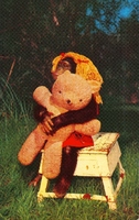 Description:Thousand Oaks, CA. A young chimp posing with a blond wig, skirt, and teddy bear. "Little Chim, chimpanzee. Current co-star in the new Tarzan serial with Gordon Scott."