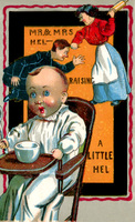Description:Early correspondence comical postcard sent from Lankershim. Postmarked February 8, 1912. Image shows cartoon on the front with a baby in a high chair waiting for food and a couple fighting in the background. Text reads: Mr. & Mrs Hel- Raising A Little Hel. [show more]