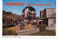 Description:Simi Valley, CA. Corriganville Movie Ranch (Santa Susana Pass area). "About one-half of all western movies" were filmed on locations at this film studio and tourist destination, according to this postcard. Card shows the "Silvertown" western street set, with an inset of Gene Autry on Champion. Postmarked Sep. 9, 1959. [show more]