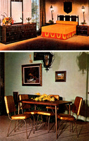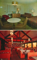 Description: Canoga Park, CA. Country Squire Motel (7631 Topanga Canyon Blvd.), two-pack with VR/PC/HM/77. Two images: bedroom with multicolored spreads; restaurant with orange vinyl booths. [show more]