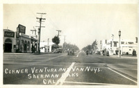 Description:Corner of Ventura and Van Nuys, Sherman Oaks, CA. Black and white image of a street scene.