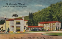 Description:North Hollywood, CA. El Dorado Motel (11056 Ventura Blvd. (US 101), street view of motel with white brick construction, Spanish tile roofs, and sign. "A Bit of Old Monterey."