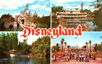 Description:Anaheim, CA. Disneyland (1313 Disneyland Dr.). Four photos: Sleeping Beauty's Castle, the Mark Twain Riverboat, guests at entrance to Tomorrowland, Jungle River Cruise. Postmarked May 13, 1971, Buena Park.